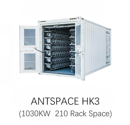 Antspace HK3 is built with efficiency and hotter climes in mind also known as production model Antbox H3 Version 6 internally has a maximum capacity of 210 Antminer S19 Pro+ Hydro with a total consumption of slightly more than 1MW includes a cooling tower and a mining container.